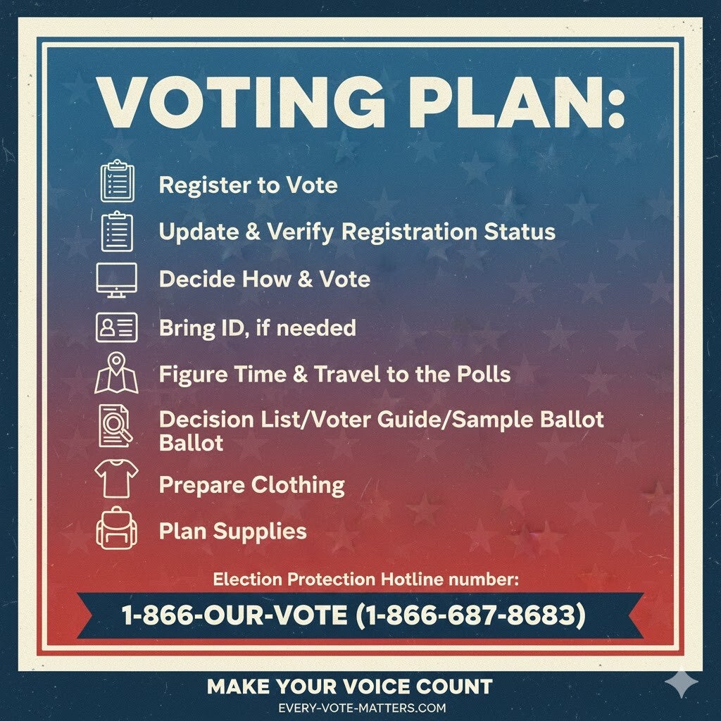 Preparing ahead ensures you won’t face surprises on Election Day. Decide how you want to vote—early, by mail, or in person. Look up your polling place or ballot drop box, plan transportation if needed, check ID requirements, and set reminders for key deadlines. A complete voting plan makes the voting process smoother, more confident, and ensures you are prepared for every step of the process. Below are the essential components to include in your plan: